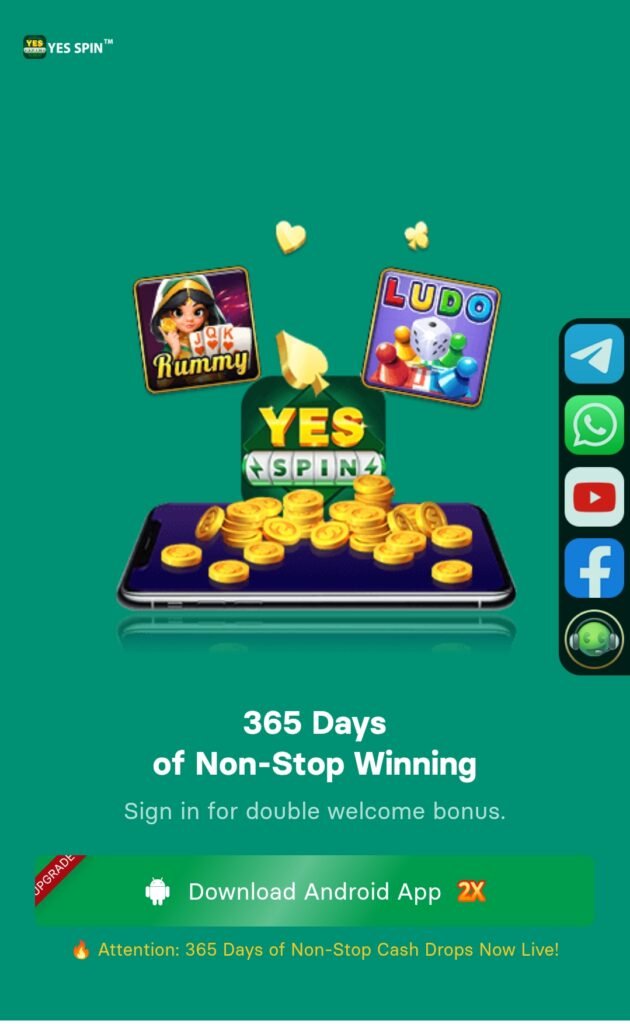 अभी YES SPIN पर फ्री Signup करें और ₹50+ Bonus पाएं। स्लॉट्स, रमी और कई कैश गेम्स खेलें। डेली बोनस और तेज़ पेमेंट के साथ इंडिया का भरोसेमंद प्लेटफॉर्म।